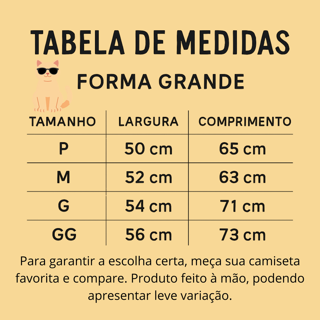 • GG: Largura 56cm | Comprimento 73cm | Manga 23cm